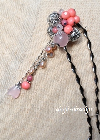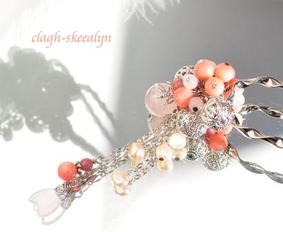 珊瑚はとても可愛いですが、性質としては大変脆いので、水に濡れたり、激しくぶつける事が少ないかんざしならば安心だな、と思い沢山付けてみました。