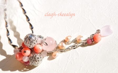 珊瑚だけでは色がハッキリとしてしまうので、優しいローズクォーツや淡水パール、そしてアクセントに4mmのロードナイトを入れてみました。