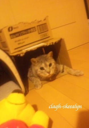 私が追いかけていると、ボロボロの段ボールに逃げ込みます