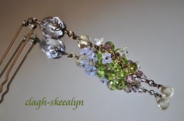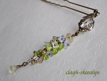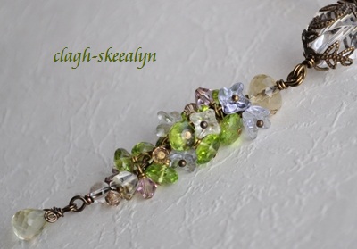 優しい雰囲気を入れたかったので、天然石以外にガラス製のお花(※2色)を使ってみました。小さなスワロフスキーも、色彩を合わせてアクセントに。