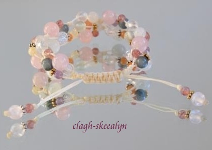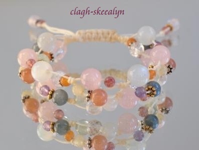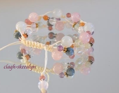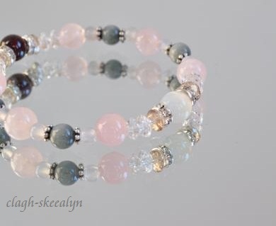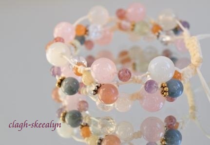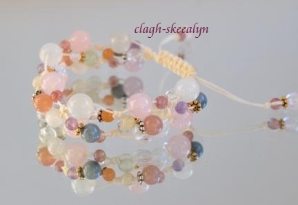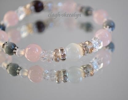 ローズクォーツとムーンストーンをベースに、ガーネットが一粒入った物。